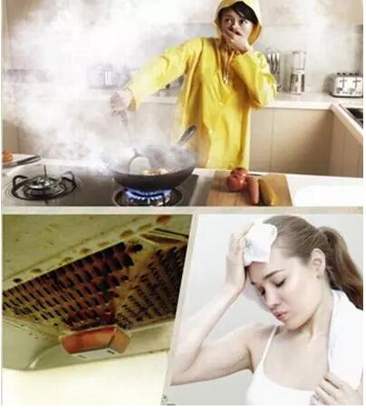 油煙不但附著在墻壁及櫥柜上,成為了清掃難題,更重要的是油煙損壞了我們的面容,傷害了我們的健康!